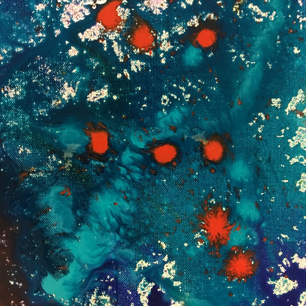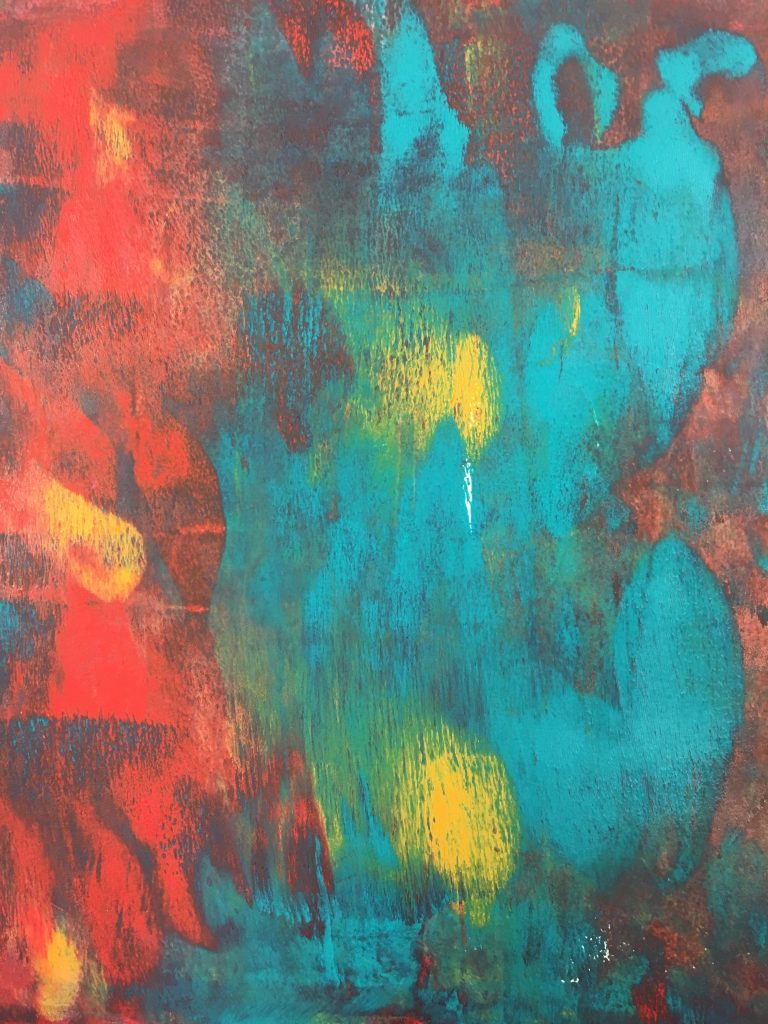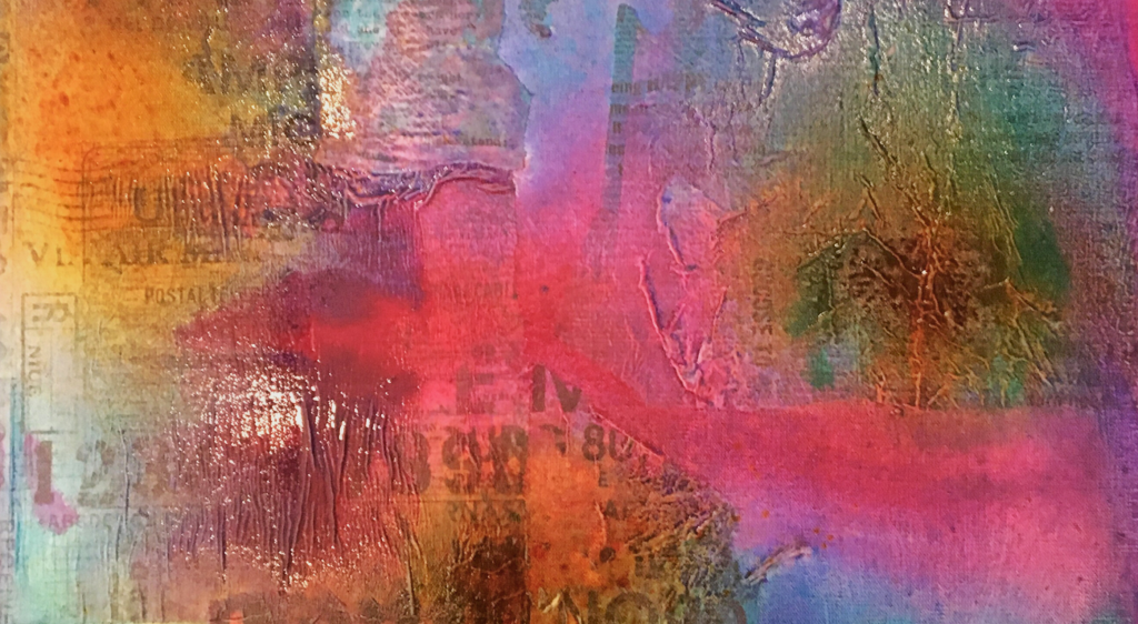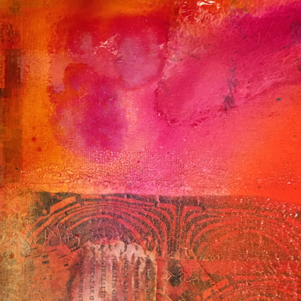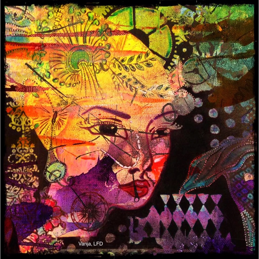“I’ve spent the last couple of weeks with Vanja. At my request, she has been passing along her vast mixed media knowledge.  I would love to consider myself her apprentice, but I think I’m more of an experimental learner. Just by looking at Vanja you can tell she has the soul of a true artist.  Her vibrant red hair and warm smile are very fitting and can put anyone at ease immediately. I am a “newbie” to the art world and, for me getting started can be the most intimidating part of being creative.  I ask a lot of questions about her process. Vanja first creates the background for the piece or for many pieces as the case may be.  There are usually several backgrounds going at once waiting to be further developed as inspiration hits. The backgrounds on their own are almost frame-worthy, but the real fun begins once the conversation between background, medium, and artist has commenced.  Layers are added to the backgrounds using different media. There are times where previous creations become part of new collages, adding yet another surprising detail to her work.  Once the background and subsequent layers are done, Vanja embellishes the piece with pen work detail. This last part can at times be labor intensive and tedious, yet something tells me it’s one of her favorite parts. When a work of art has as many layers as Vanja’s, how does she know she is done? It’s a sensation where she no longer needs to add anything; the piece simply feels complete.” – Carlos M